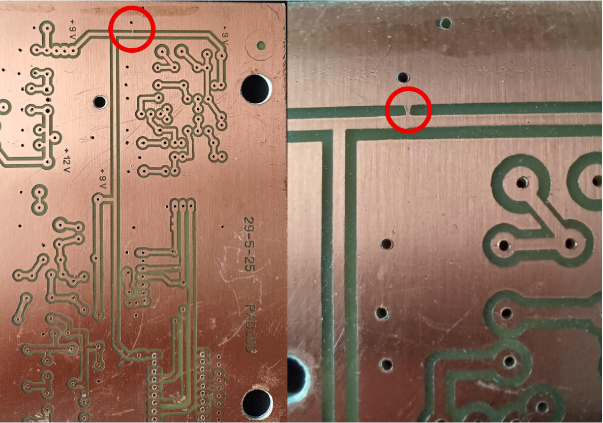 De 1nF op de print is helaas kortgesloten hieronder is aangegeven waar u de print verbinding op 2 plaatsen moet doorkrassen en waar u (bij de pijl “Aanbrengen”) de C van 1 nF moet plaatsen.